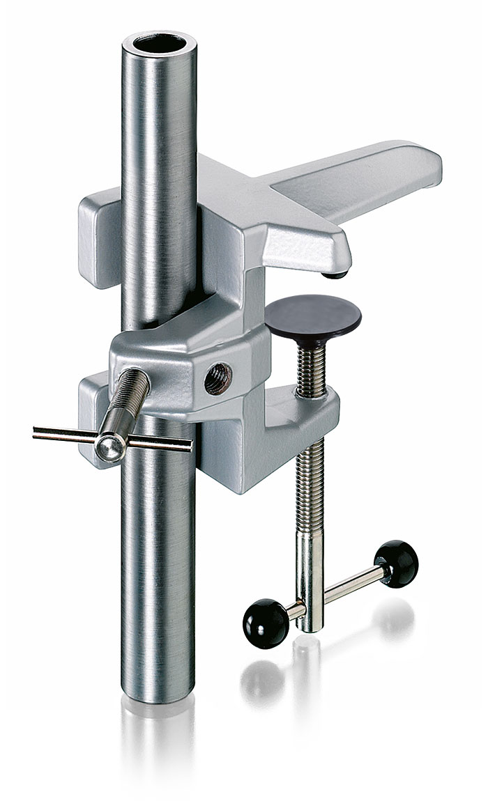 De tafelklem kan ronde- en vierkante- statiefstaven tot 26 mm diameter vastklemmen.