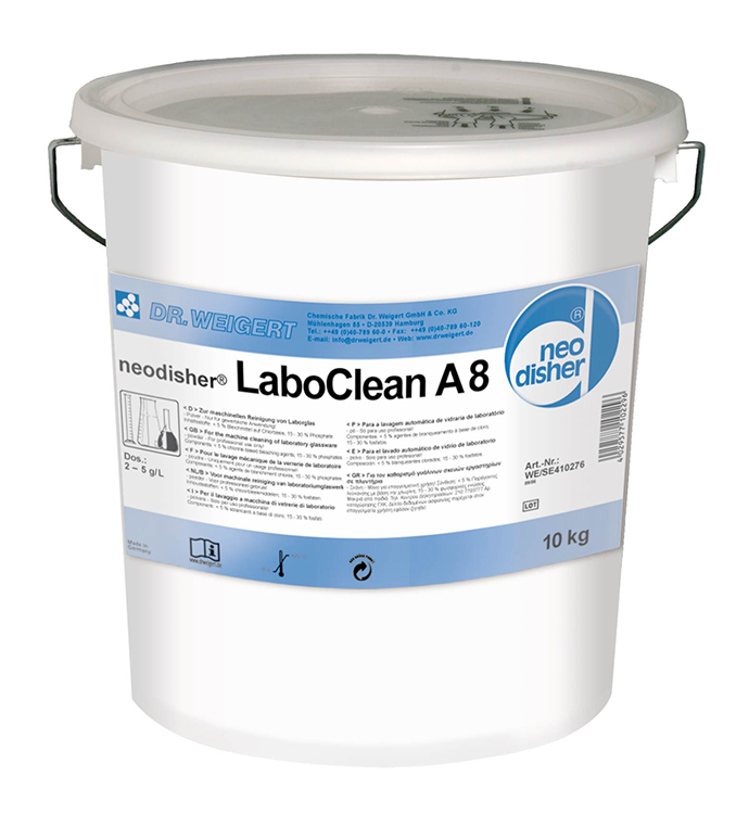 LaboClean A8 is een alkalisch, intensief reinigingsmiddel voor in de laboratorium reinigingsmachine in allerlei laboratoria, het poeder bevat geen tensiden.